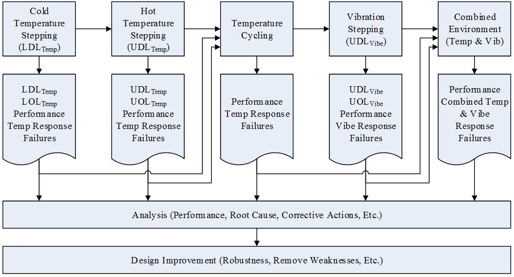 The HALT process is used to identify potential areas of design improvement for consideration by the design team. HALT is a destructive test that attempts to expose the weakest points in the design to increase the robustness and expected life of the final product. This is accomplished using a short duration test that exceeds expected operating conditions in order to accelerate failure modes. HALT failures are analyzed using trade study techniques to determine if potential corrective actions are appropriate. The resulting final design will be more robust after the weakest points in the design have been identified and corrective actions put in place.